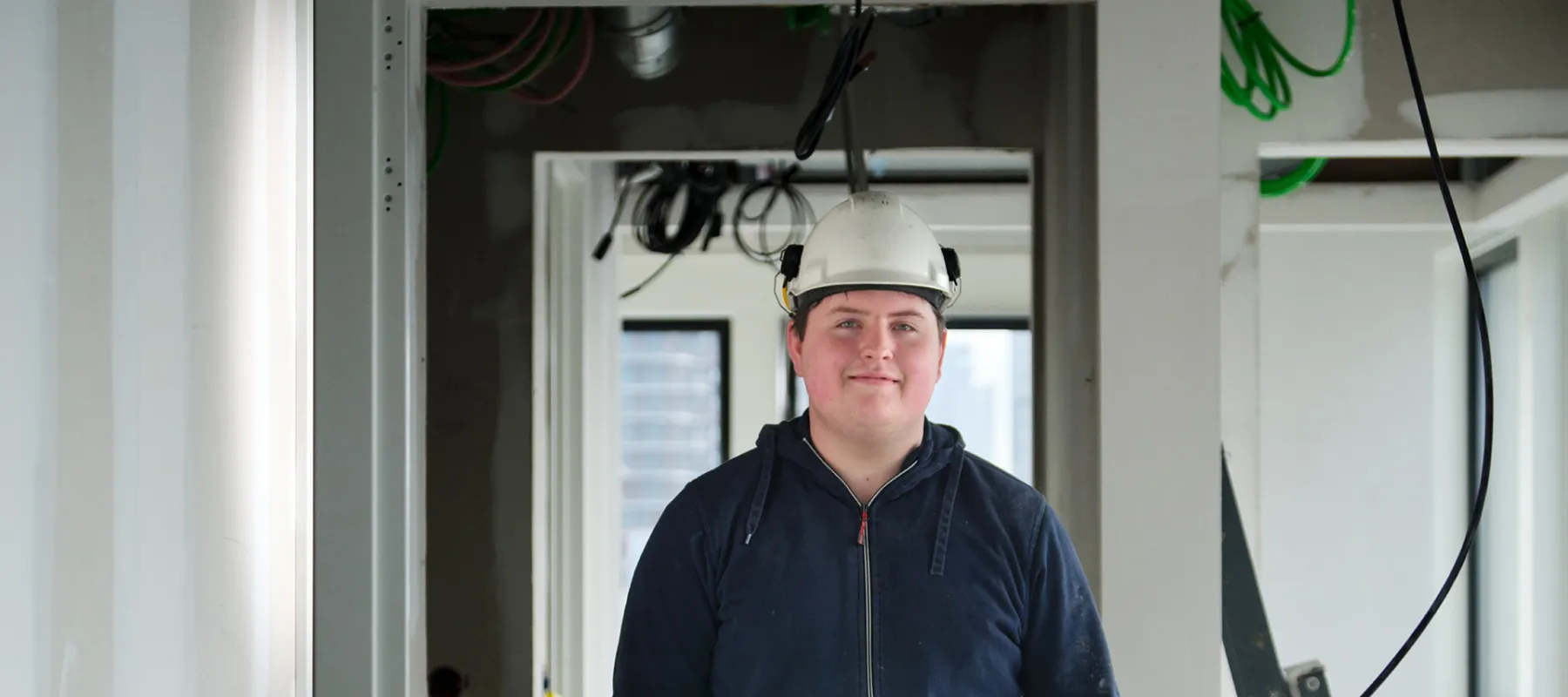 Profielfoto bij de functie monteur, werkt geconcentreerd aan de bedrading van een technische installatie in een werkplaats.