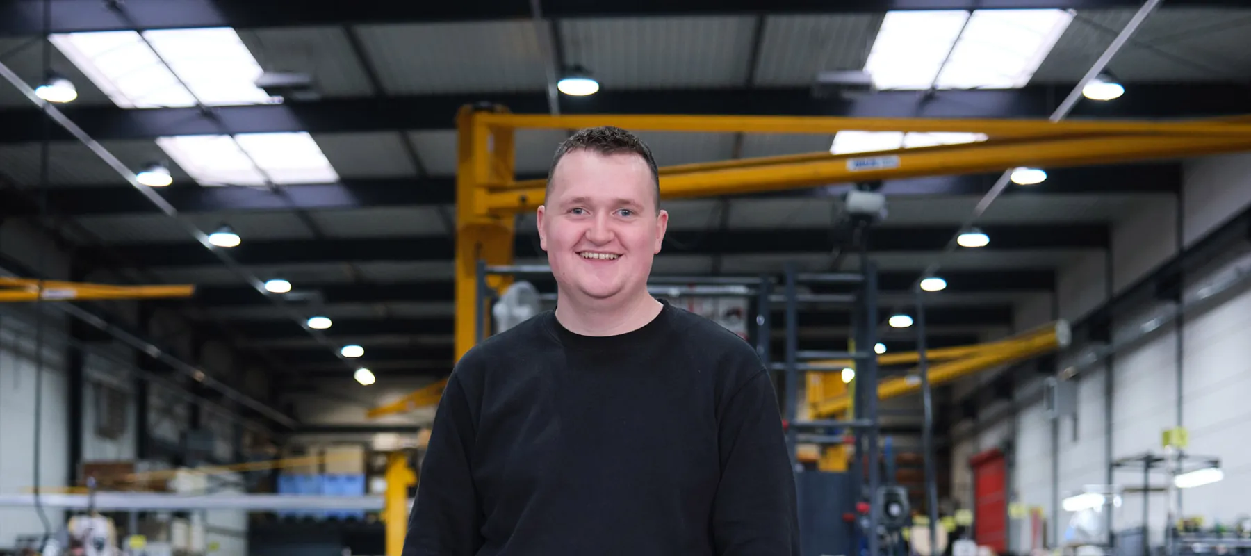 Profielfoto bij functie technisch medewerker. Man bedient een machine en controleert instellingen in een werkplaats.