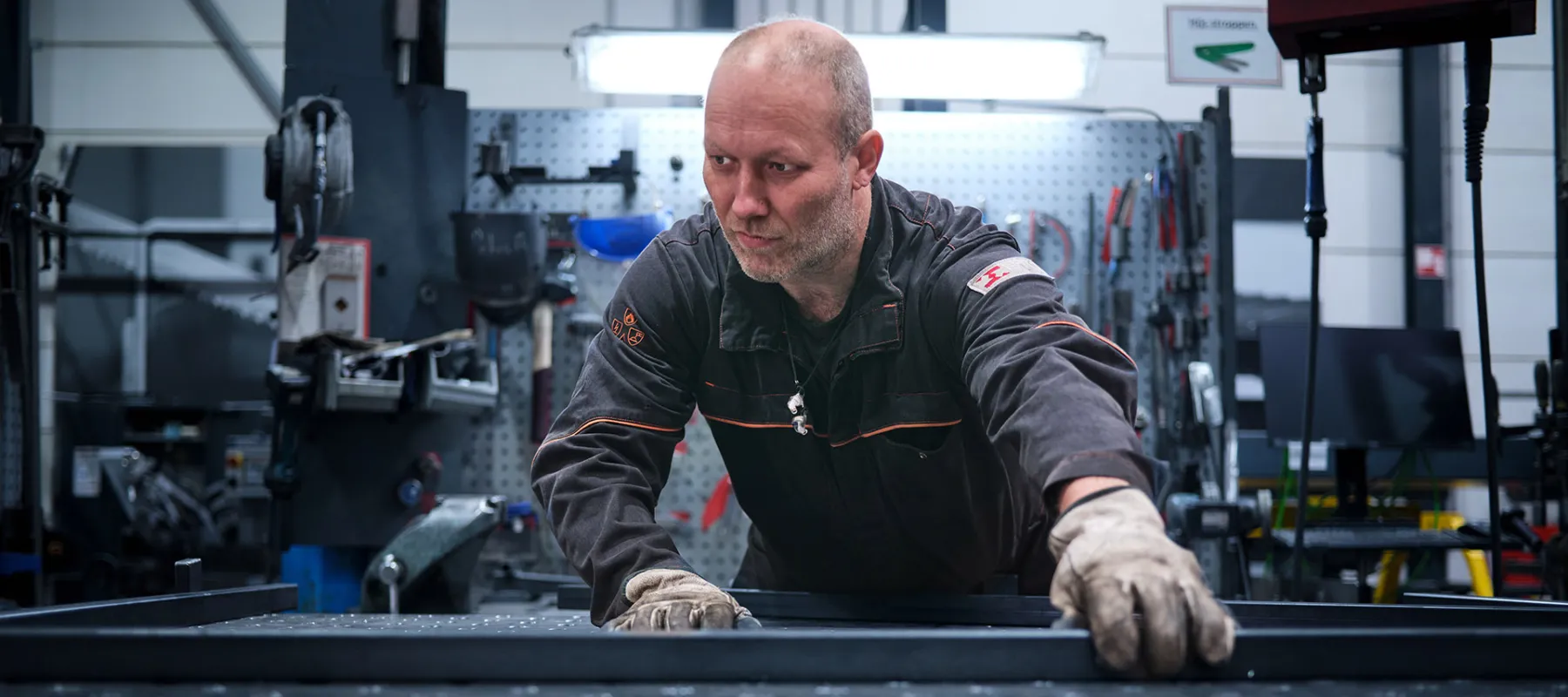 Profielfoto bij de functie medewerker assemblage. Een monteur werkt aan een metalen onderdeel aan een werkbank vol gereedschap.