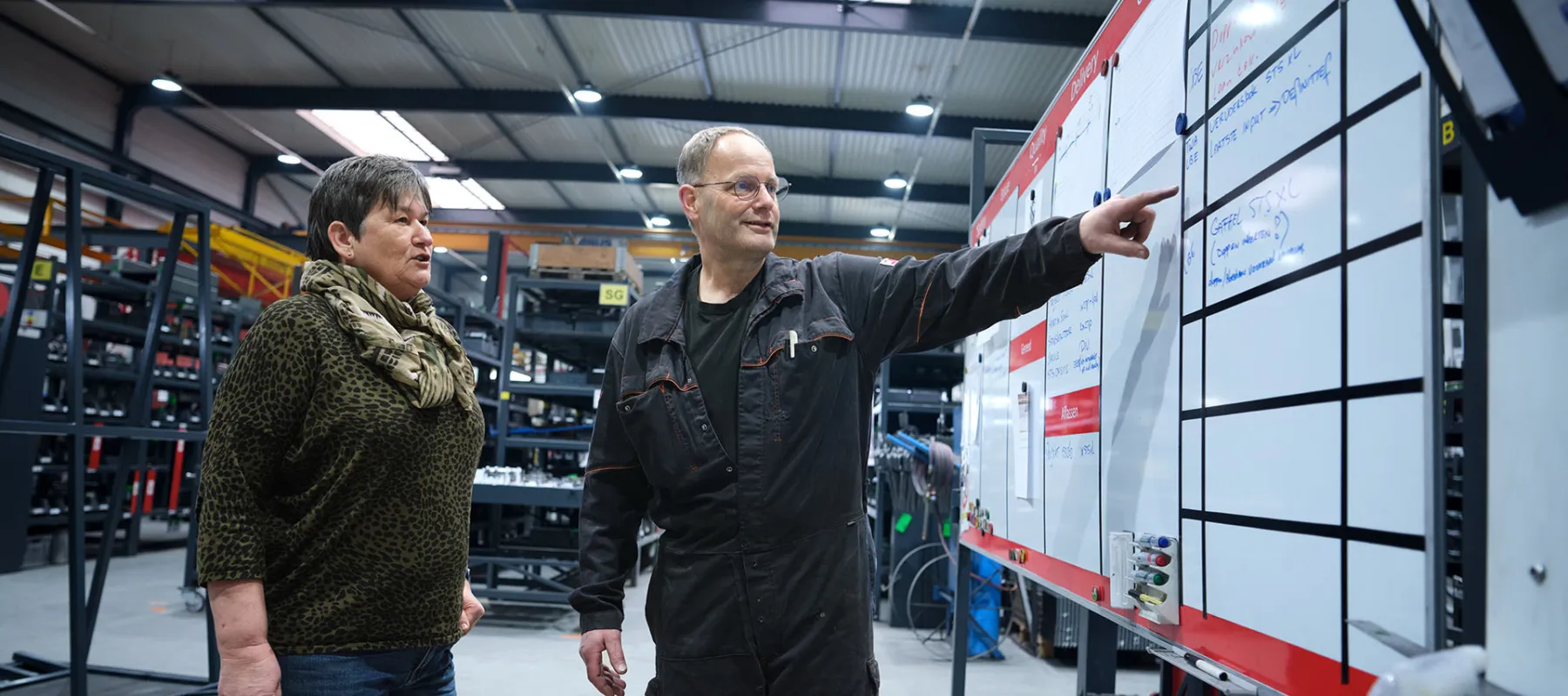 Profielfoto bij de functie senior onderhoudstechnicus WTB in de sector energie. Een man wijst iets aan op een planbord terwijl hij met een collega overlegt in een werkplaats.
