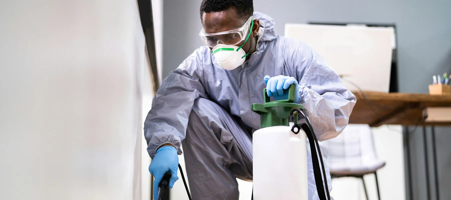 Profielfoto van de plaagdierbestrijder. De plaagdierbestrijder in beschermende kleren en een mondmasker.