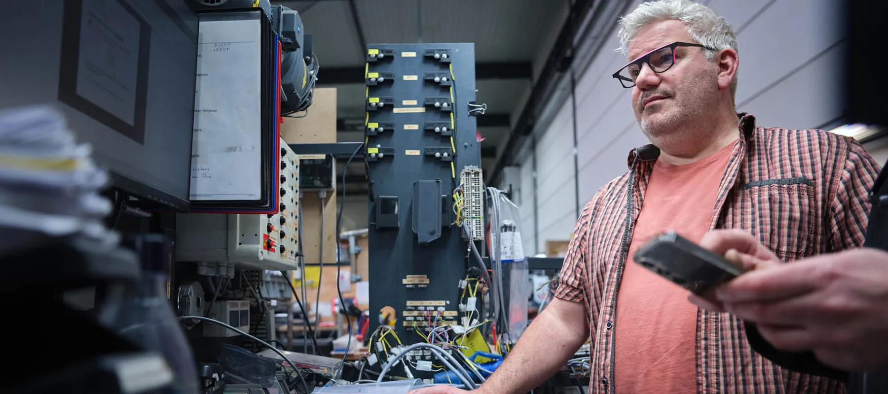 Profielfoto bij functie technisch medewerker. Man bedient een machine en controleert instellingen in een werkplaats.