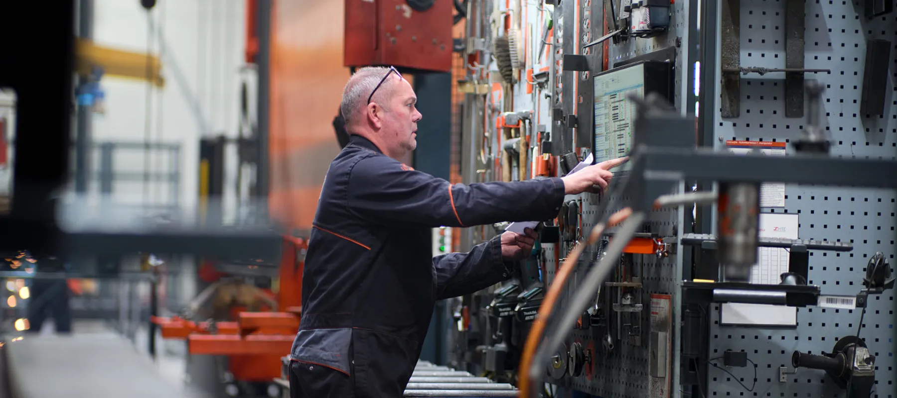 Profielfoto bij functie technisch medewerker. Man bedient een machine en controleert instellingen in een werkplaats.