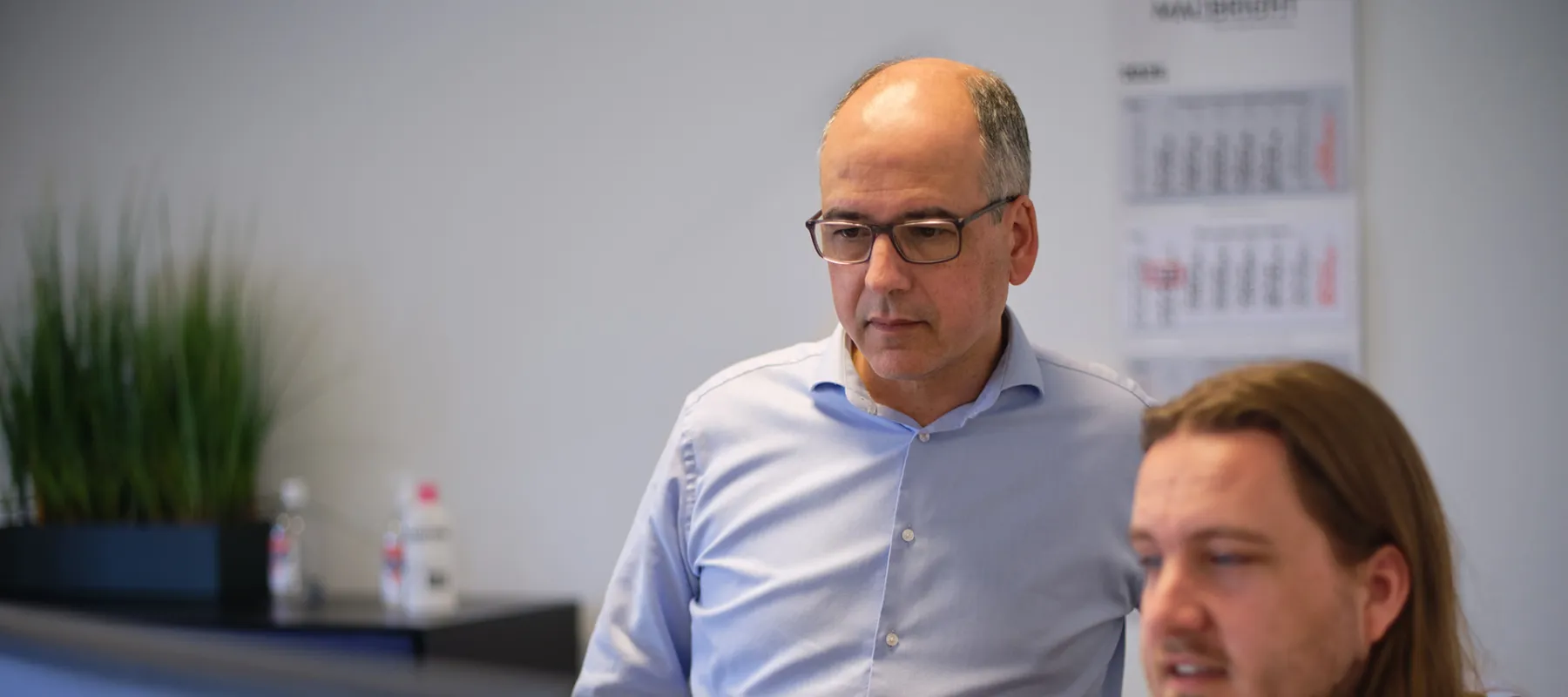 Profielfoto van twee mannen. Kijken samen naar een computerscherm op kantoor.