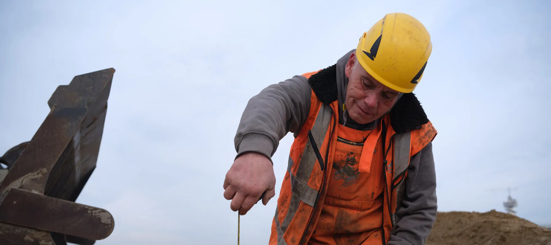 Profielfoto van de functie opperman bestrating sector infra. Opperman met gele helm meet op een zandige bouwplaats ter voorbereiding van bestratingswerk.