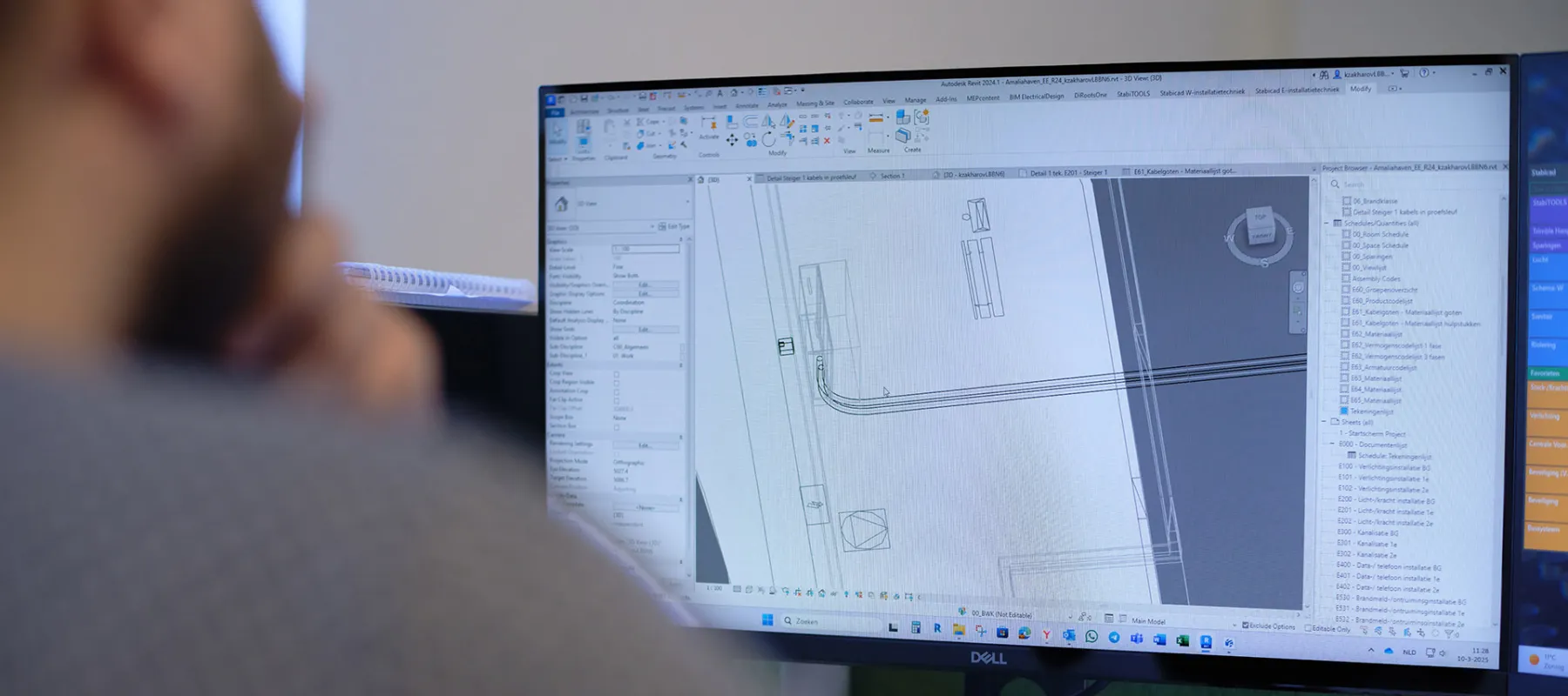 Profielfoto van technisch ontwerper bekijkt een 3D-model en technische tekening op twee computerschermen.