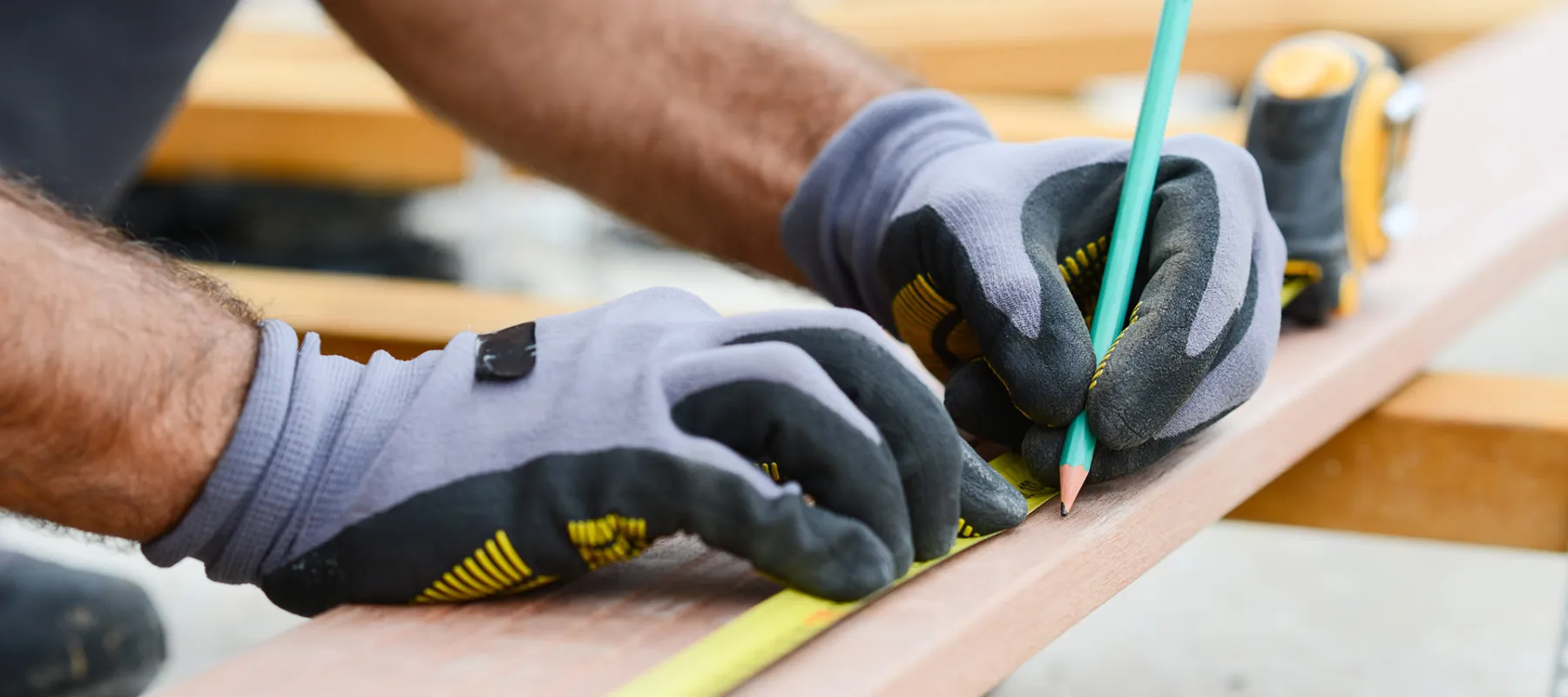 Profielfoto bij functie timmerman. Handen meten en markefen houten balk met potlood.