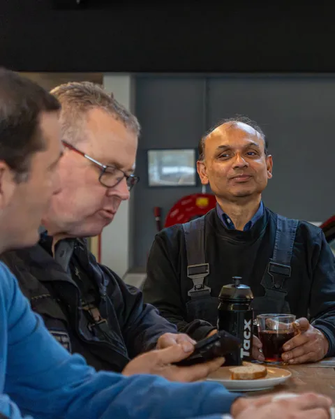 Tijd voor een welverdiende koffiepauze. Samen met zijn collega’s komt Soerinder bijeen in de showroom. Het team is hecht, ze kunnen alles met elkaar bespreken.