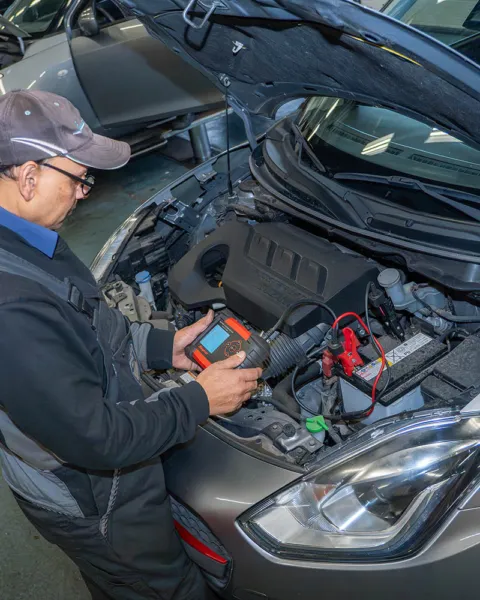 Soerinder leest de accu uit met een digitaal diagnoseapparaat. Moderne auto’s vragen om meer dan alleen technische vaardigheden, ook digitale zijn belangrijk. De techniek verandert snel en Soerinder blijft continu bijleren..